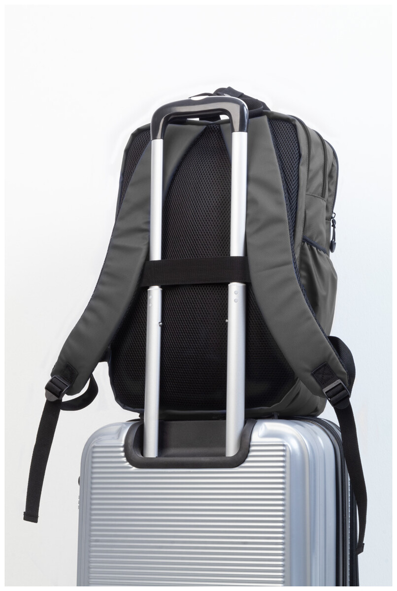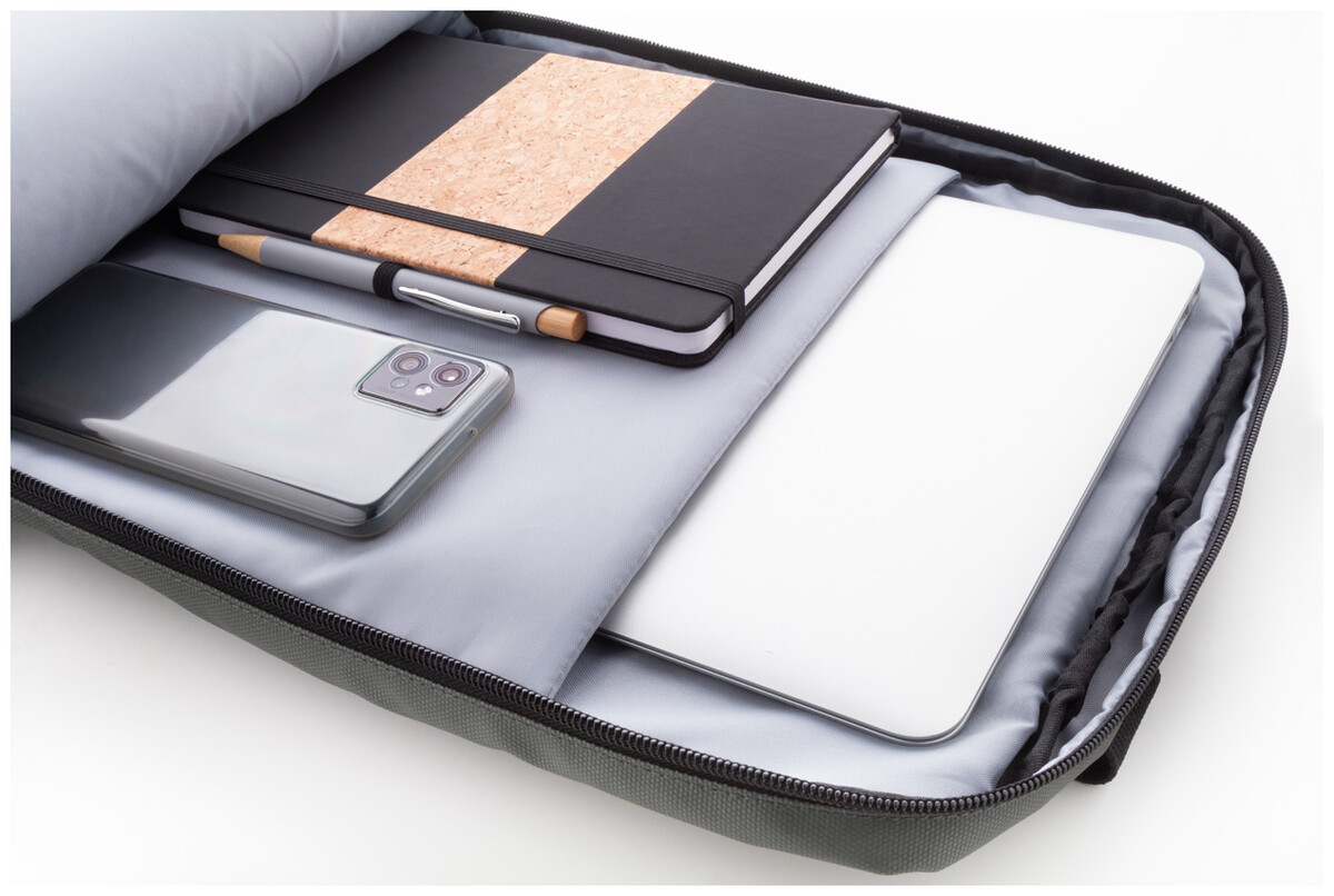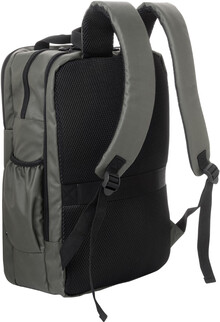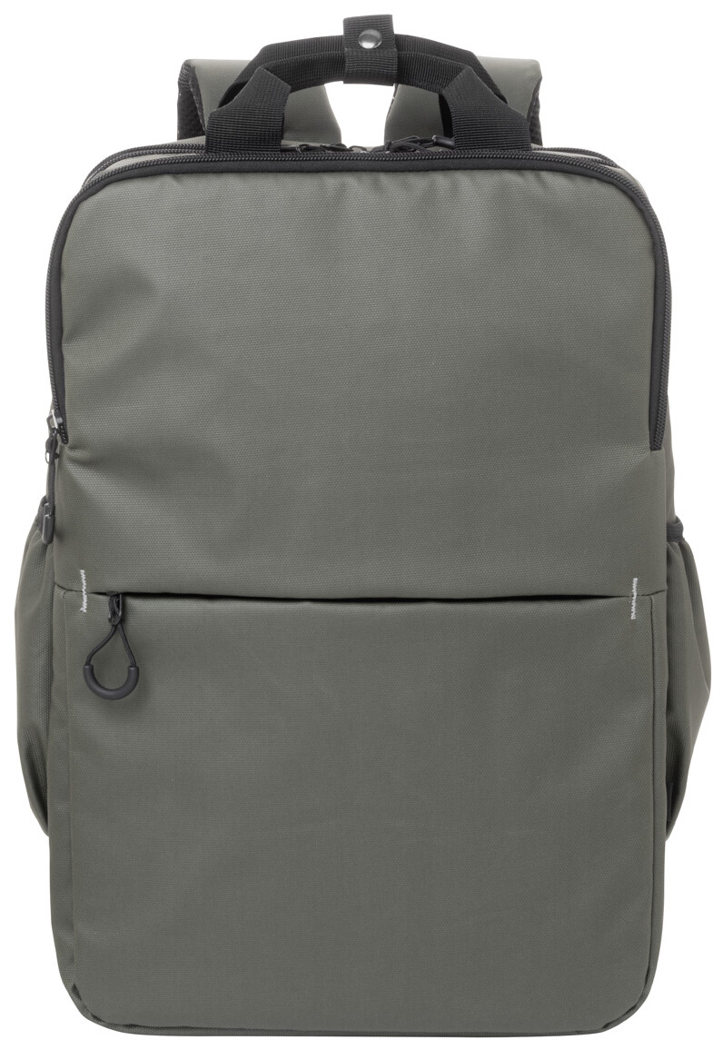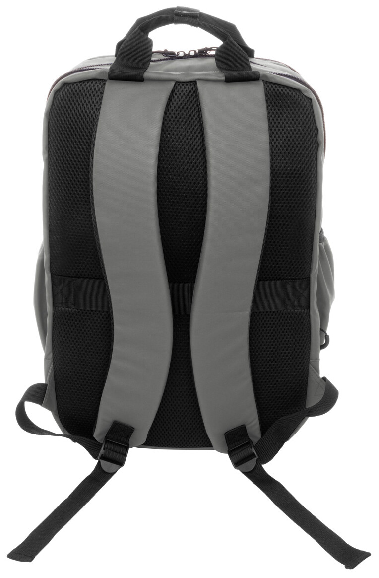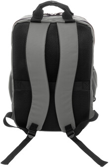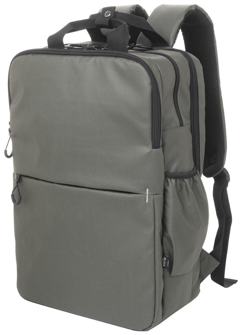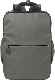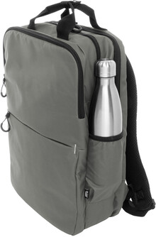 Vodotěsný batoh RPET se 2 přihrádkami na zip, 2 předními kapsami na zip, bočními kapsami a polstrovanou přihrádkou na notebook (16"). S popruhem na vozík, polstrovanými zády a ramenními popruhy. Polyester 600D RPET potažený PU, s výrazným štítkem RPET.