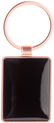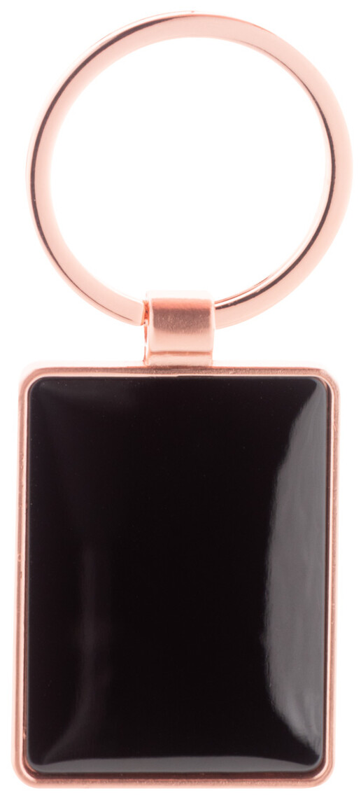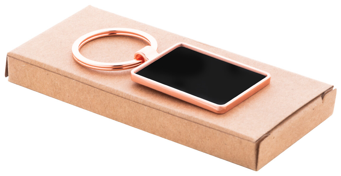 Kovový přívěsek na klíče obdélníkového tvaru ve zlatém provedení s bronzovým plátem. V kraftové papírové krabici.