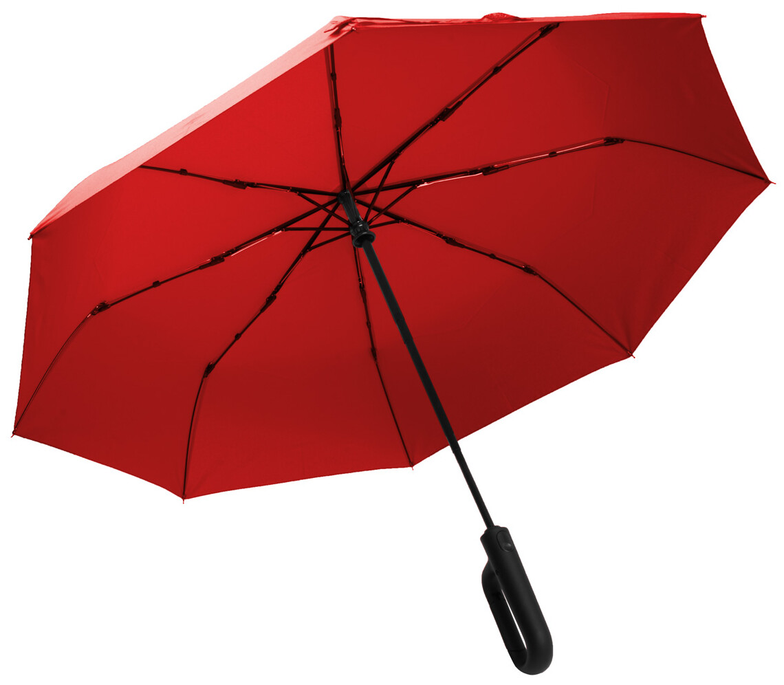 Plně automatický (otevřít/zavřít), větruodolný skládací deštník s 8 panely v pouzdře ve stejné barvě. S kovovým rámem, sklolaminátovými žebry a pogumovanou karabinou. Pongee 190T RPET. S výrazným štítkem RPET.