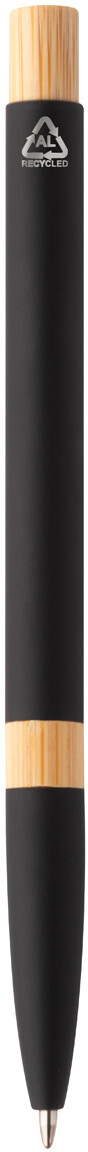 Kuličkové pero z recyklovaného hliníku s bambusovými částmi, pogumovaným povrchem a chromovým klipem. Se speciální vrstvou pro zrcadlové laserové gravírování. S modrou náplní.