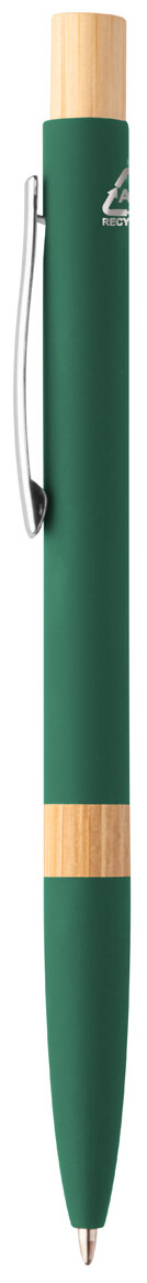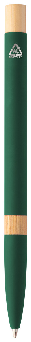 Kuličkové pero z recyklovaného hliníku s bambusovými částmi, pogumovaným povrchem a chromovým klipem. Se speciální vrstvou pro zrcadlové laserové gravírování. S modrou náplní.
