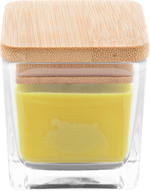 Vosková svíčka na rostlinné bázi ve skleněném držáku s bambusovým víčkem. S 50 gramy vosku. Doba hoření: 8 hodin. V kraftové papírové krabici.