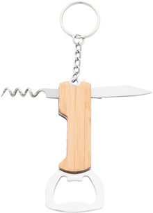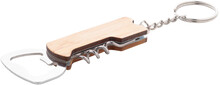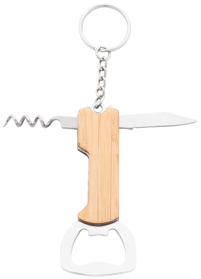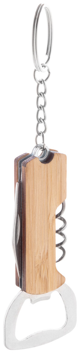 Přívěšek na klíče s otvírákem na láhve z bambusu a nerezové oceli s vývrtkou a kapesním nožem.