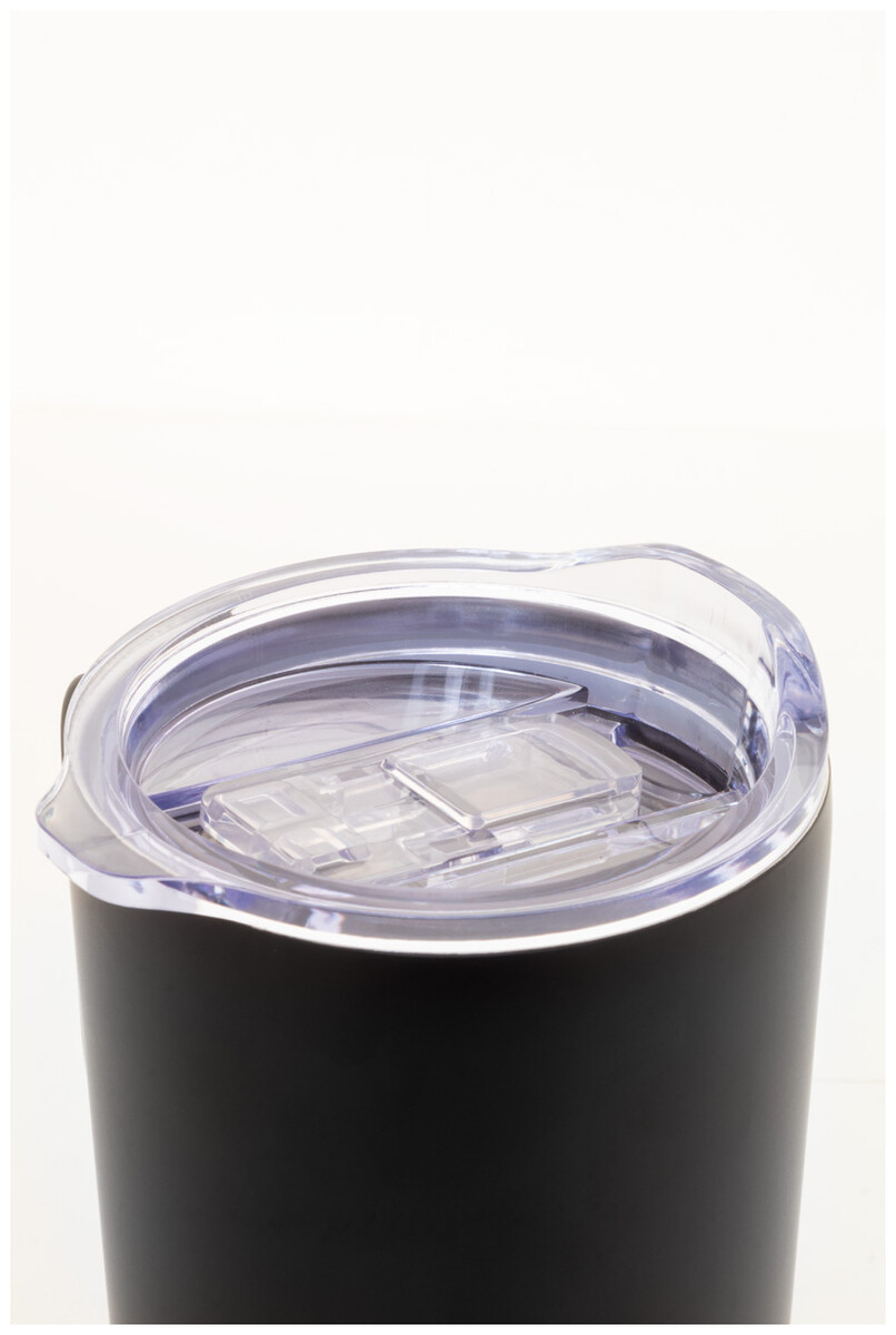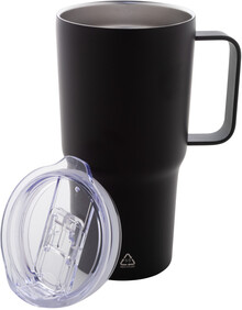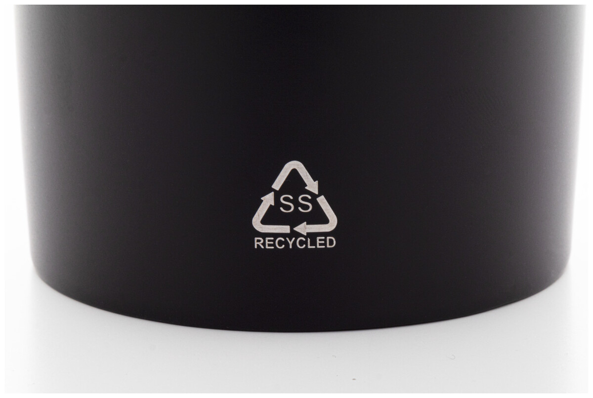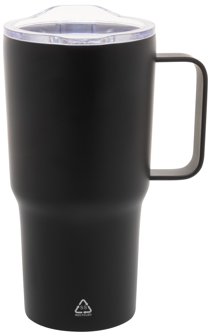 Dvoustěnný vakuově izolovaný termo hrnek z recyklované nerezové oceli s plastovým víčkem na pití z PS. 600 ml.
