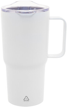 Dvoustěnný vakuově izolovaný termo hrnek z recyklované nerezové oceli s plastovým víčkem na pití z PS. 600 ml.