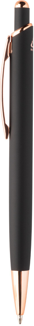 Kuličkové pero z recyklovaného hliníku s pogumovaným povrchem a detaily z růžového zlata. Se speciální povrchovou úpravou pro zrcadlové laserové gravírování v barvě růžového zlata. S modrou náplní.