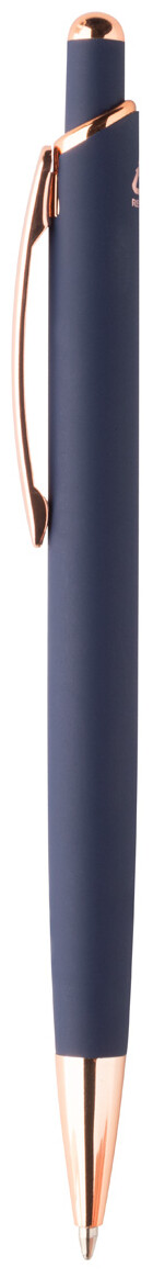 Kuličkové pero z recyklovaného hliníku s pogumovaným povrchem a detaily z růžového zlata. Se speciální povrchovou úpravou pro zrcadlové laserové gravírování v barvě růžového zlata. S modrou náplní.
