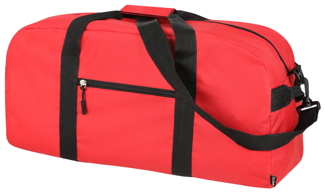 Sportovní taška RPET s hlavními přihrádkami na zip a přední kapsou, nastavitelný ramenní popruh. Polyester 600D RPET, s výrazným štítkem RPET.
