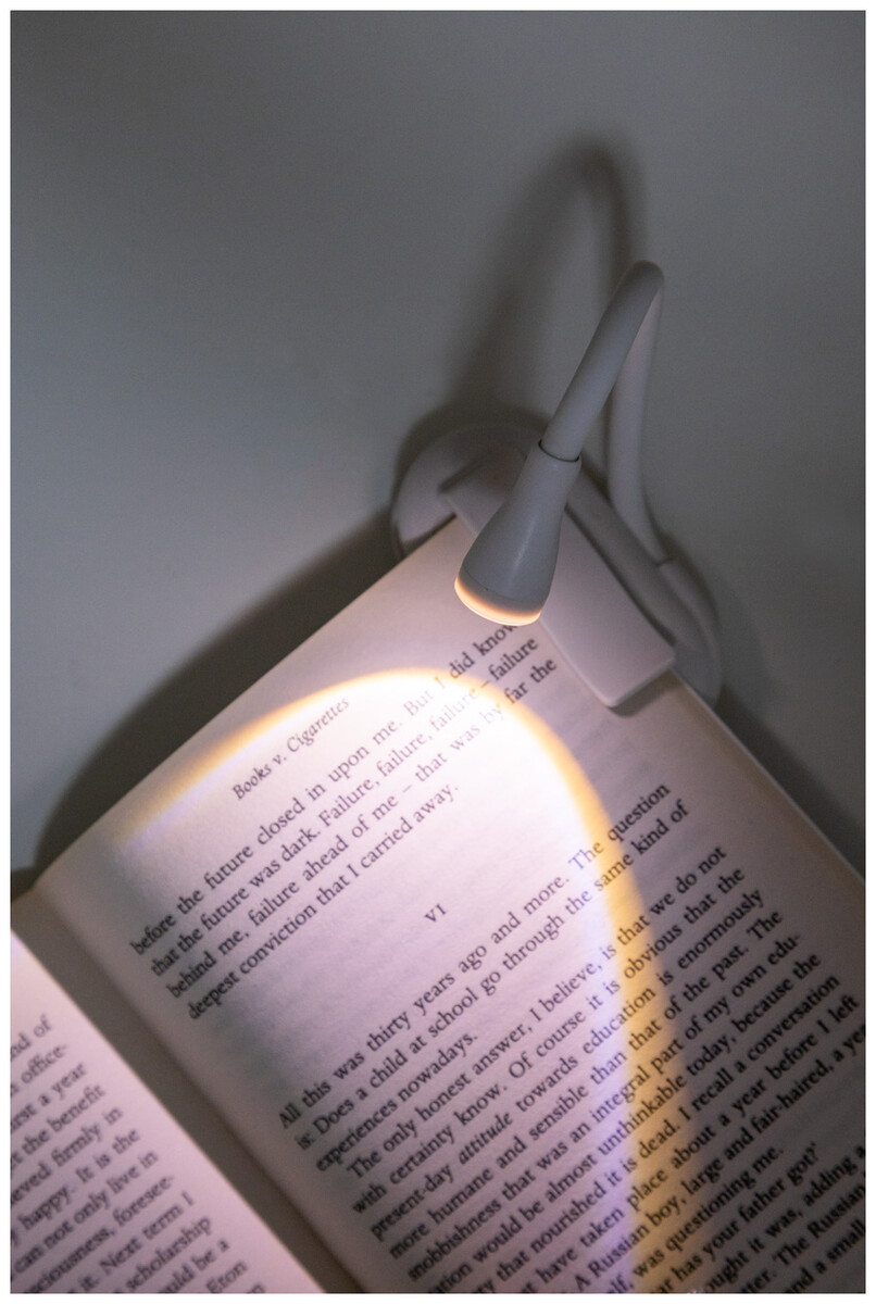 Klipová lampička na čtení z ABS s flexibilní LED lampou a vestavěnou USB dobíjecí baterií (220 mAh). S režimy teplého, přirozeného a studeného světla. Včetně USB nabíjecího kabelu.