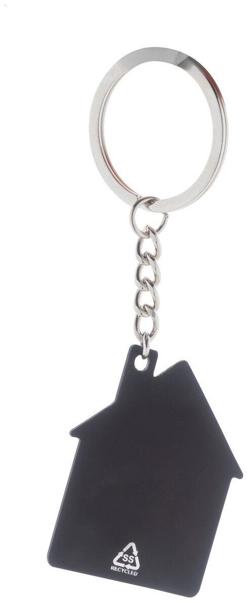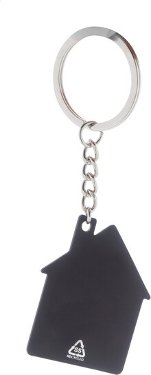 Přívěšek na klíče z recyklované nerezové oceli ve tvaru domečku s pogumovaným povrchem. Se speciální vrstvou pro zrcadlové laserové gravírování.