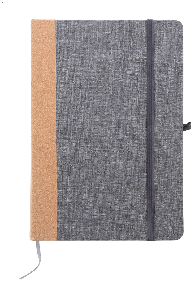 Blok A5 potažený polyesterem RPET s hřbetem z přírodního korku a 80 linkovanými listy z recyklovaného papíru. Se záložkou, gumovým páskem a držákem na pero.