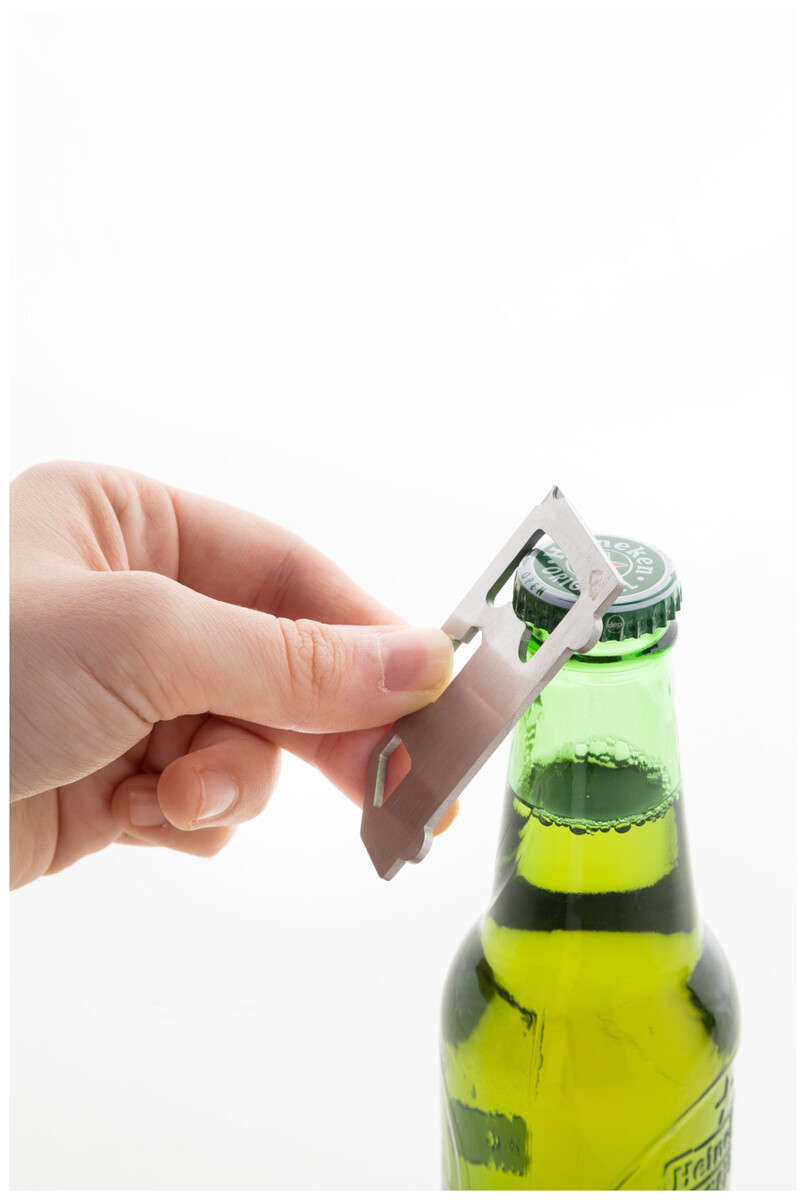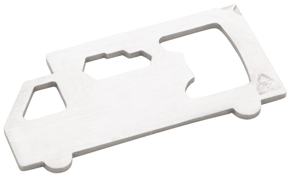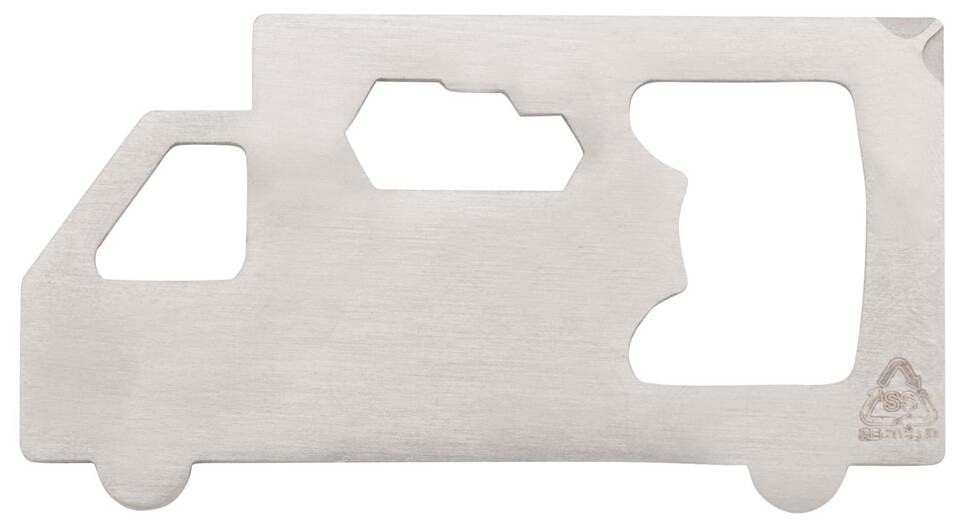 Multifunkční nářadí z recyklované nerezové oceli ve tvaru náklaďáku s otvírákem na láhve, šroubovákem Philips a 3 plochými klíči.