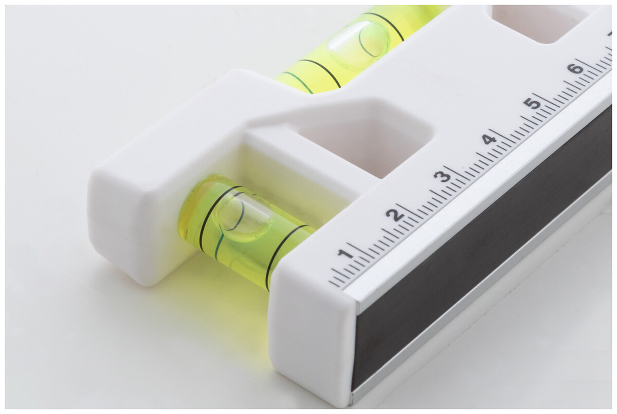 Multifunkční přívěšek na klíče z recyklovaného ABS s kovovým kroužkem, pravítkem, magnetem a dvojitou vodováhou.