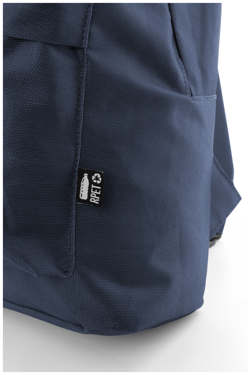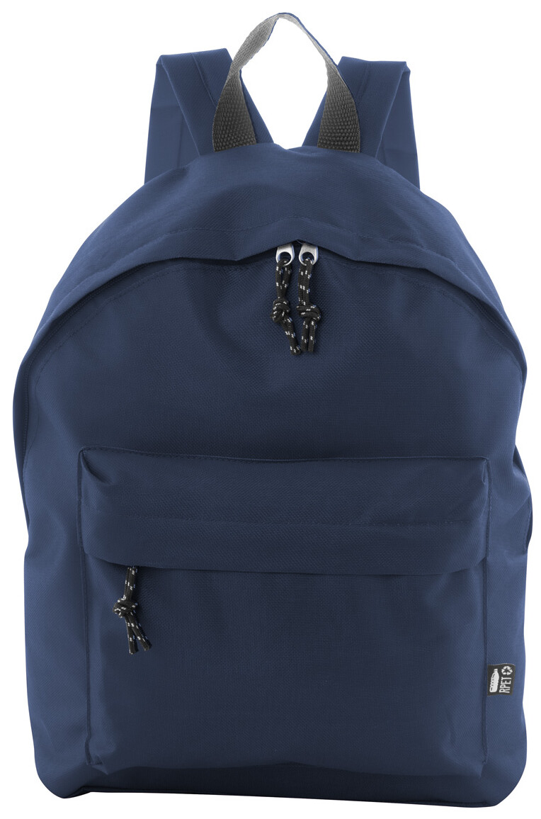 RPET batoh s hlavním prostorem na zip, přední kapsou na zip, polstrovanými zády a ramenními popruhy. Polyester 600D RPET, s výrazným štítkem RPET.