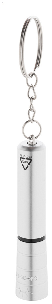 Mini baterka s 1 LED, z recyklovaného ABS plastu s kovovým povrchem a kovovým kroužkem na klíče. S knoflíkovou baterií.