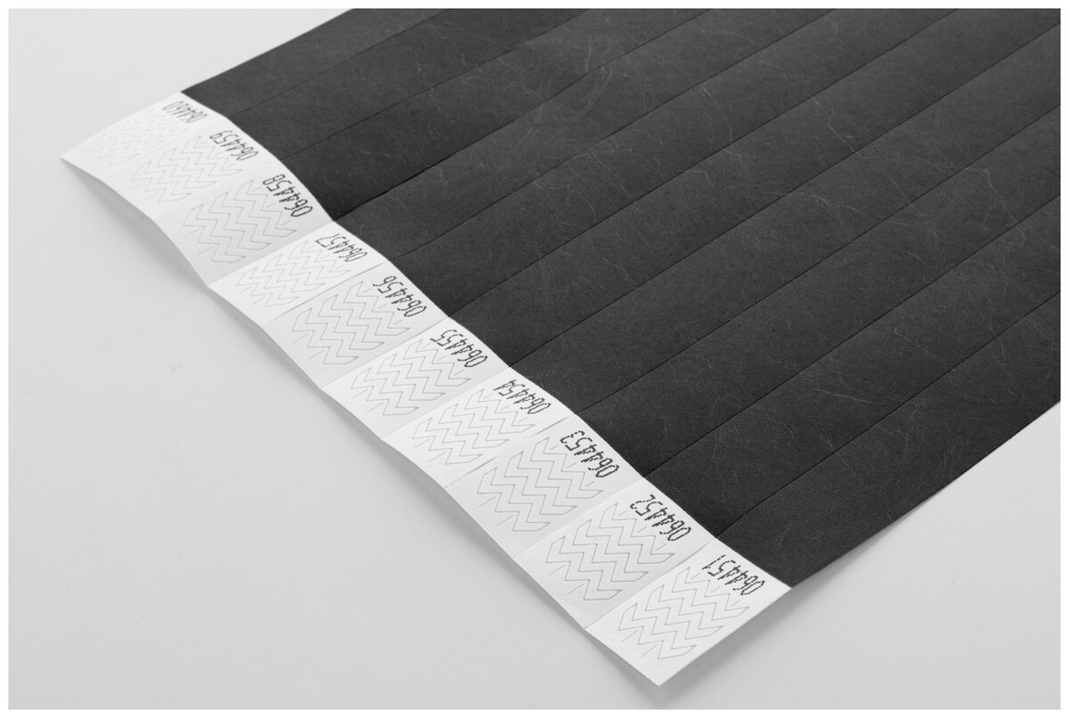 Jeden arch 19 mm širokých tyvekových náramků (10 ks) s lepicím bezpečnostním uzávěrem a jedinečným číslováním.