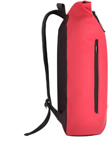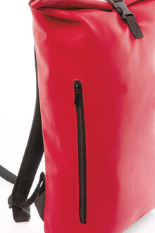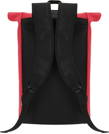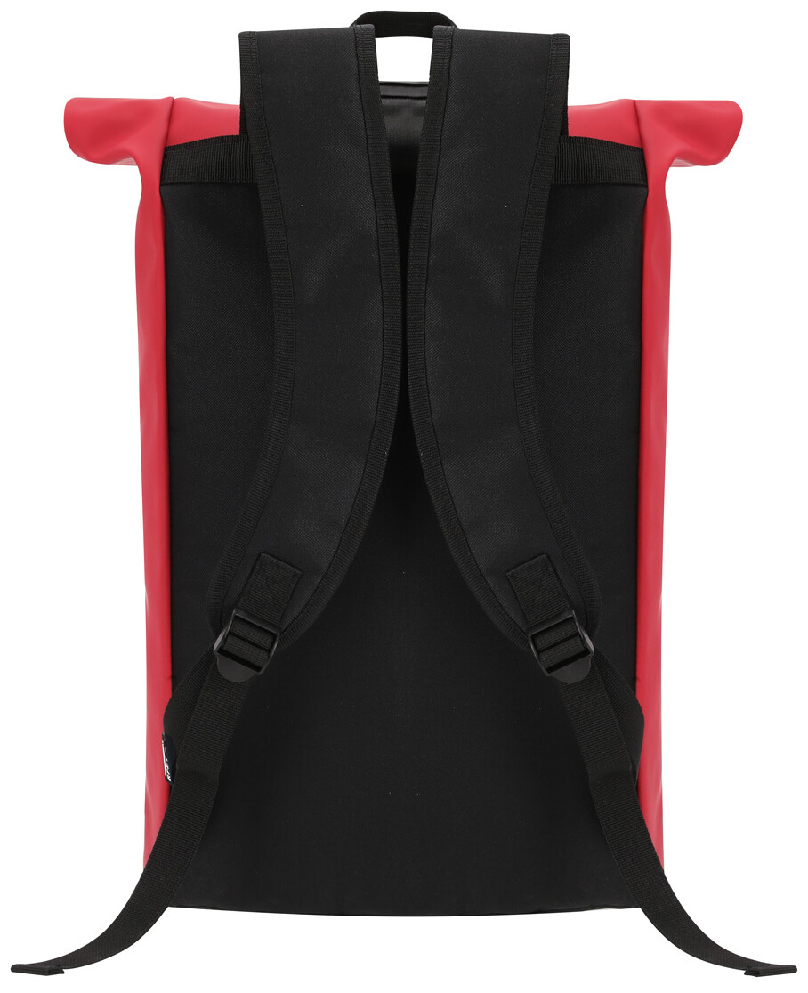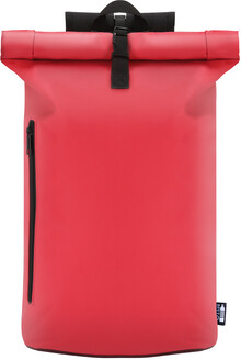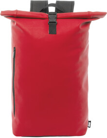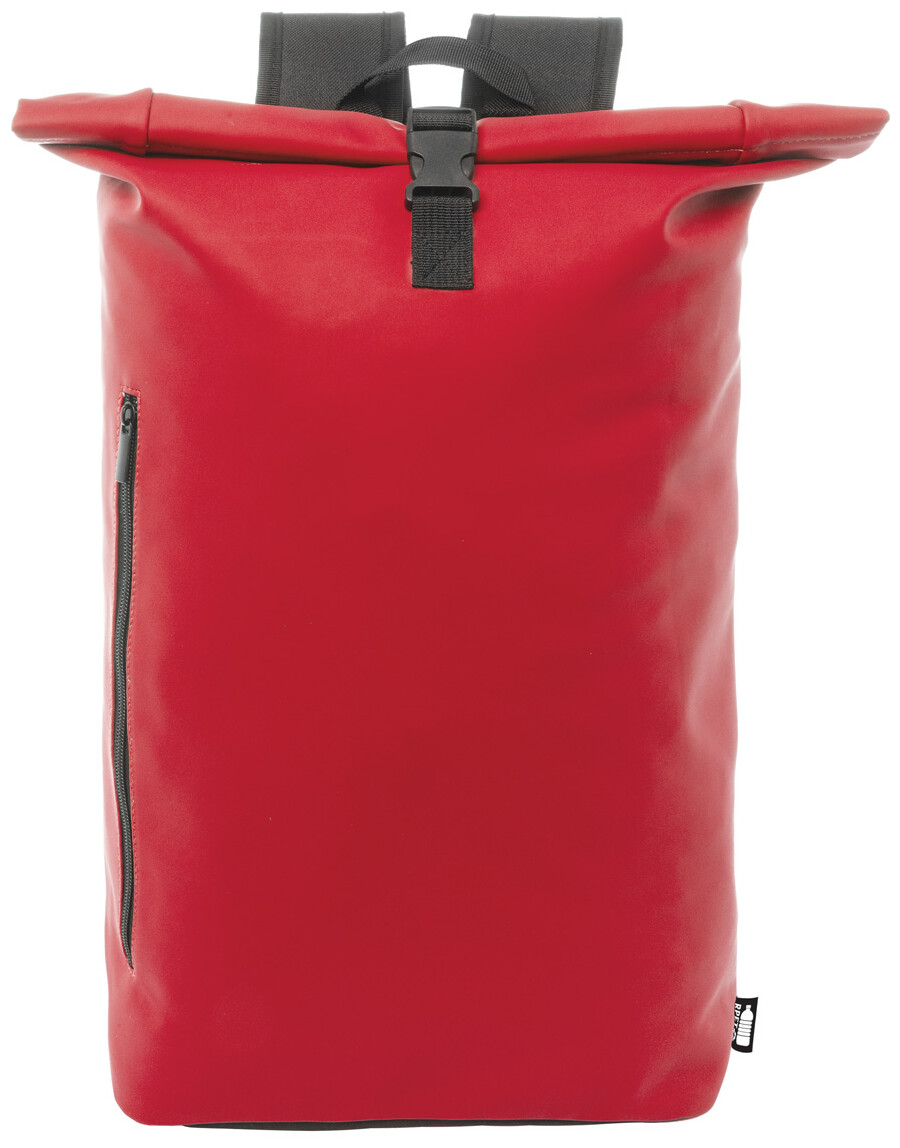 Vodotěsný, měkký rolovací batoh z recyklované PU kůže se zapínáním na přezku, přední kapsou na zip a polstrovanou přihrádkou na notebook (15"). S polstrovanými zády a ramenními popruhy. S výrazným recyklovaným PU štítkem.