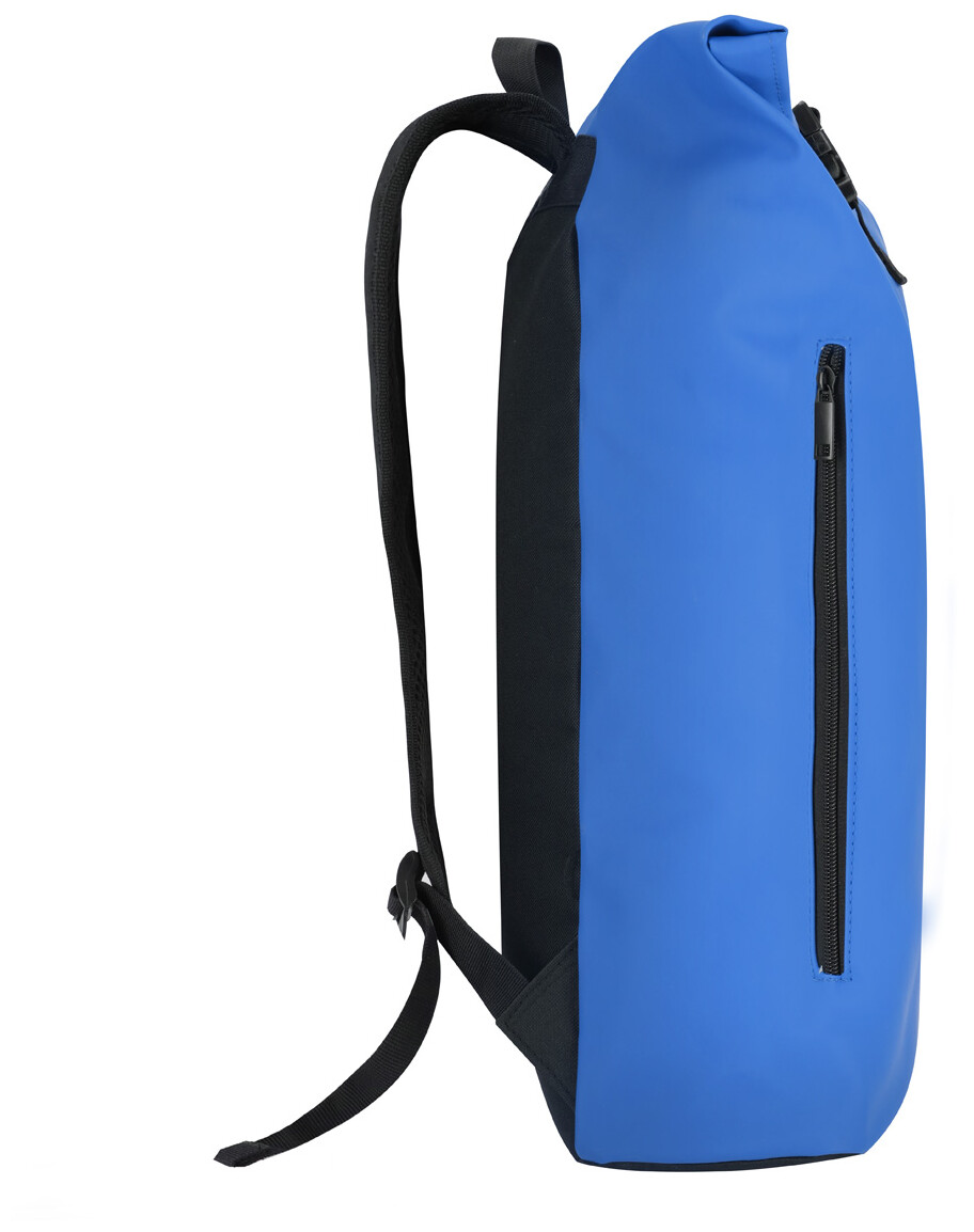 Vodotěsný, měkký rolovací batoh z recyklované PU kůže se zapínáním na přezku, přední kapsou na zip a polstrovanou přihrádkou na notebook (15"). S polstrovanými zády a ramenními popruhy. S výrazným recyklovaným PU štítkem.