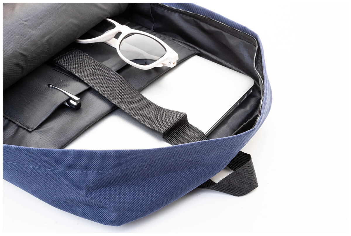 Batoh RPET s hlavním oddílem na zip, 2 předními kapsami na zip, bočními kapsami a polstrovanou přihrádkou na notebook (15") a tablet (10") S polstrovanými zády a ramenními popruhy. Polyester 600D RPET, s výrazným štítkem RPET.