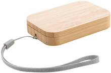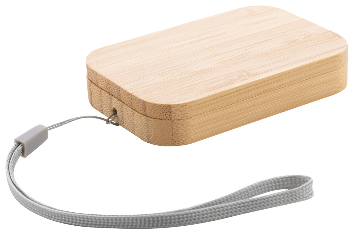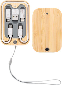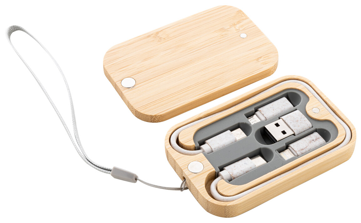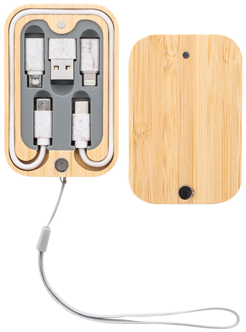 Ekologická sada USB nabíjecího kabelu z pšeničné slámy v magnetickém bambusovém pouzdře s popruhem na přenášení. Včetně kabelu USB-C s adaptéry USB, micro USB a Lightning.