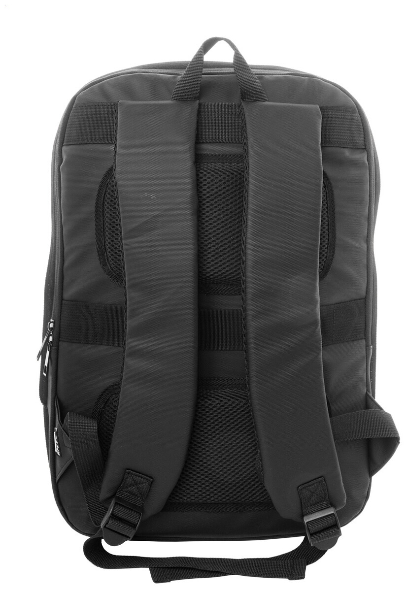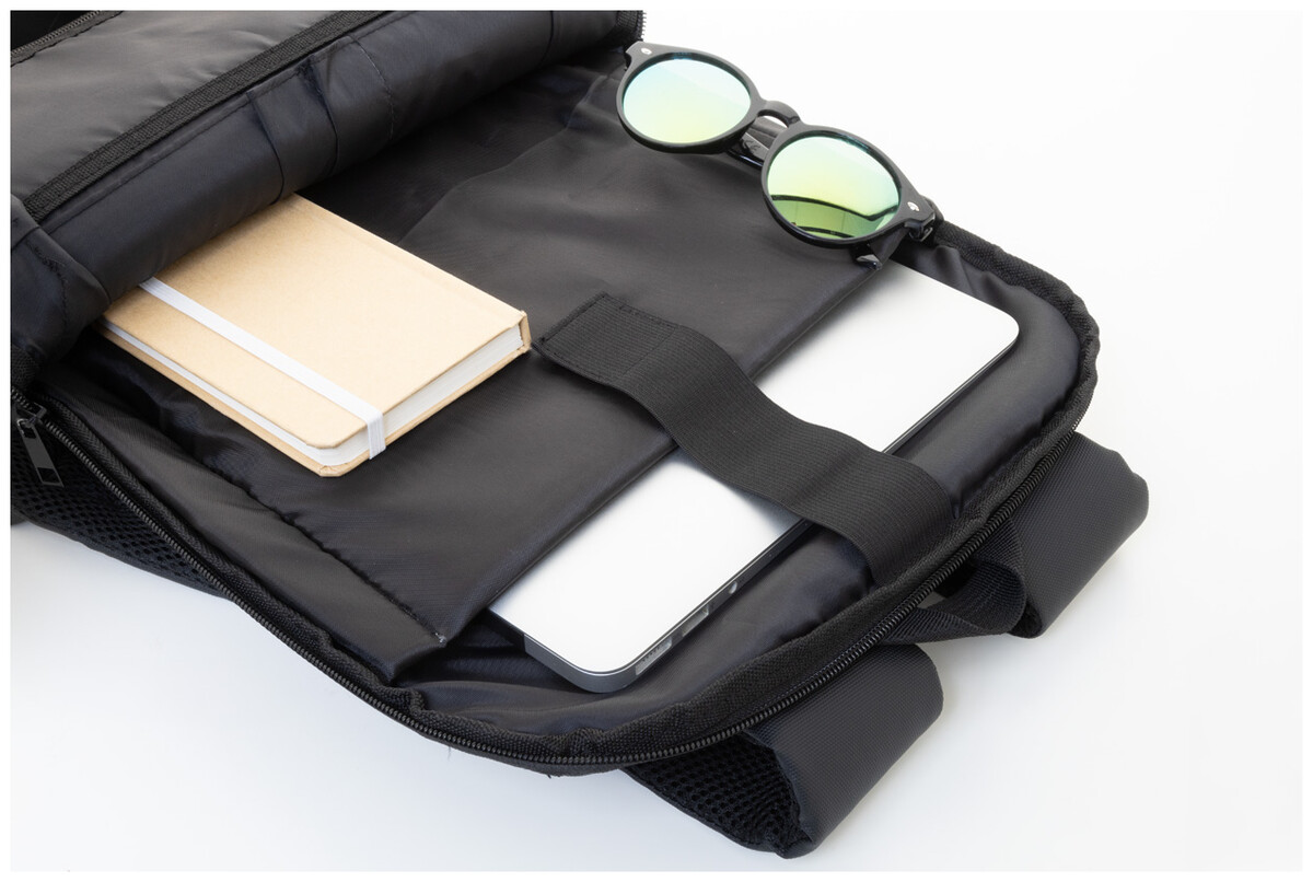 Vodotěsný, RPET rozšiřitelný batoh s hlavní přihrádkou na zip, přední kapsou na zip a polstrovanou přihrádkou na notebook (15"). S popruhem na vozík, polstrovanými zády a ramenními popruhy. Polyester 600D RPET potažený PU, s výrazným štítkem RPET.