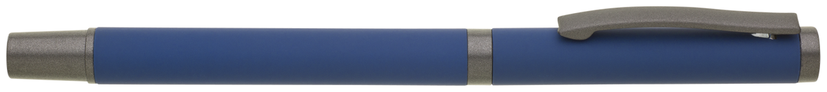 Elegantní kovový roller RIFLO SOFT v modré barvě s tmavě šedými doplňky a pogumovaným povrchem. Náplň v rolleru píše modře.
