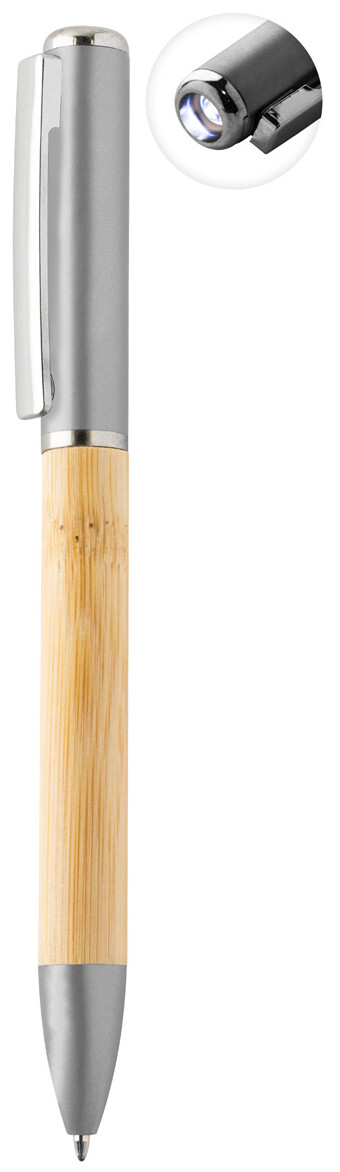 Kuličkové pero z bambusu a recyklovaného ABS plastu s 1 LED svítilnou. S modrou náplní a knoflíkovou baterií.