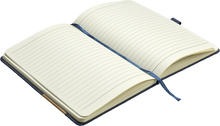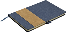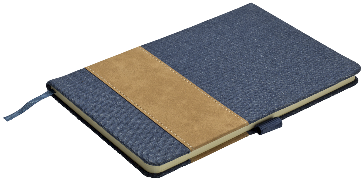 Poznámkový zápisník A5 v deskách v kombinaci tmavě modré denimové látky a PU kůže má 80 linkovaných listů z krémového papíru o hmotnosti 70 g/m2. Blok má poutko na propisku a textilní záložku v modré barvě.
