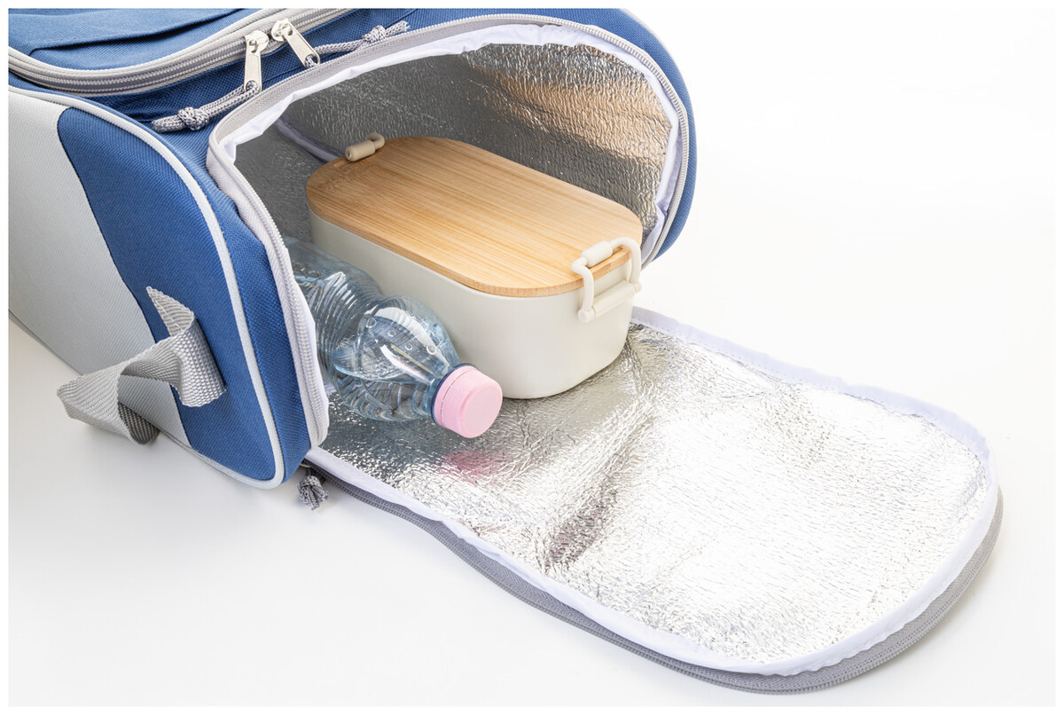 Chladicí taška RPET s hliníkovým polstrováním. Se 2 přihrádkami na zip, malou přední kapsou a nastavitelným ramenním popruhem. 600D RPET polyester s výrazným štítkem RPET.