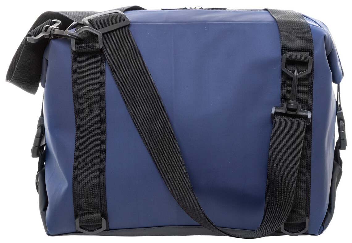 Skládací chladící taška na zip z měkké recyklované PU kůže s hliníkovou výplní a přední kapsou na zip. S bočními přezkami, držadly a nastavitelným ramenním popruhem. Tašku lze složit naplocho pro snadné skladování nebo ji během používání zajistit pomocí bočních výztuh.