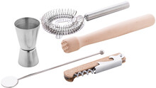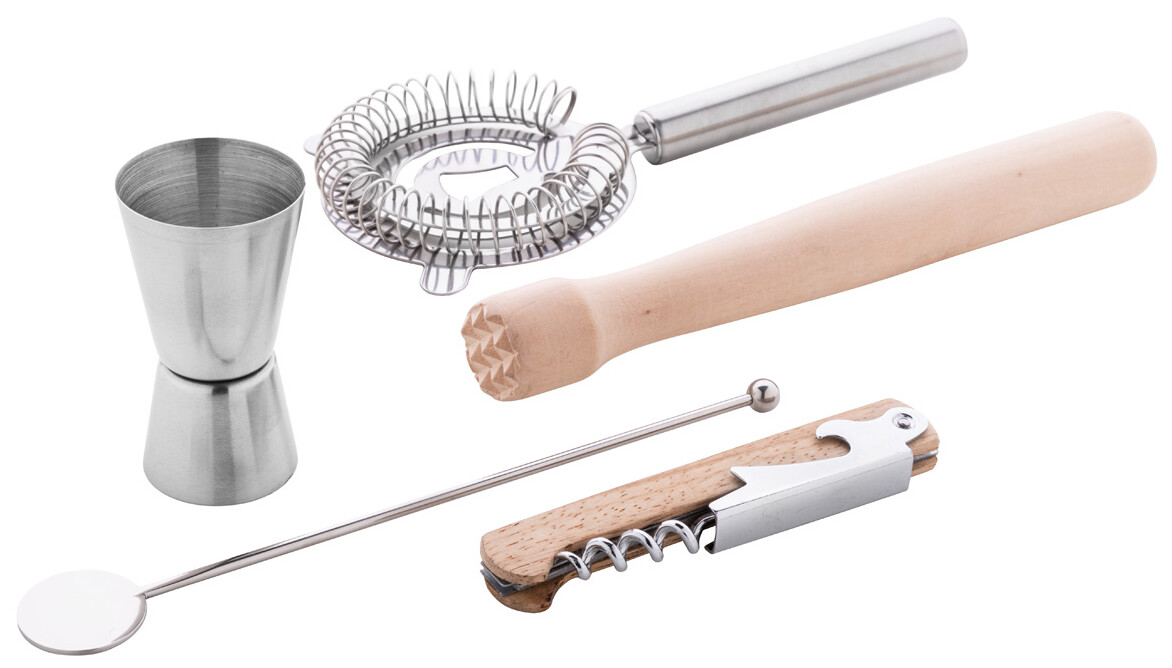 5dílná koktejlová sada v praktickém bavlněném sáčku. Včetně: nerezové odměrky, sítka a barové lžíce, vývrtky s bambusovou rukojetí a dřevěného tloučka.