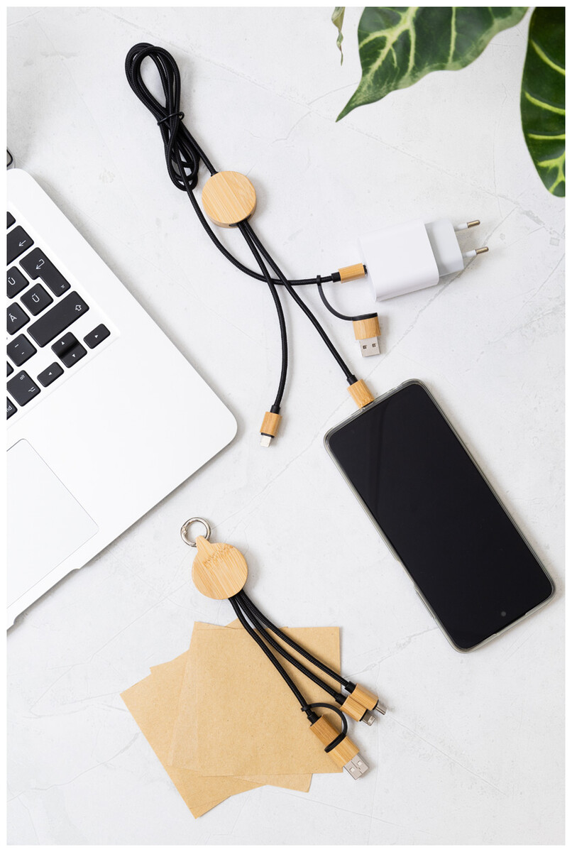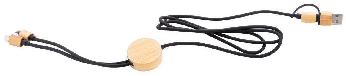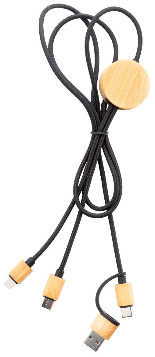 RPET a bambusový USB nabíjecí kabel s micro USB, USB-C a Lightning konektory. Se vstupy USB a USB-C. Délka kabelu: 100 cm.