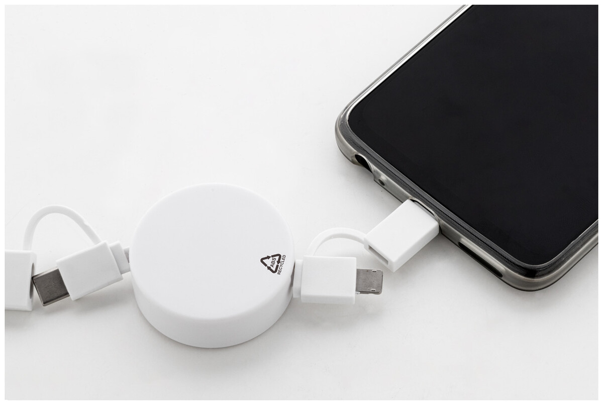 Teleskopický nabíjecí kabel USB z recyklovaného ABS s konektory micro USB, USB-C a Lightning. Se vstupy USB a USB-C.