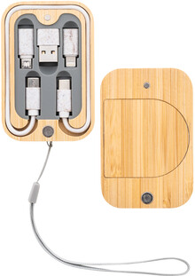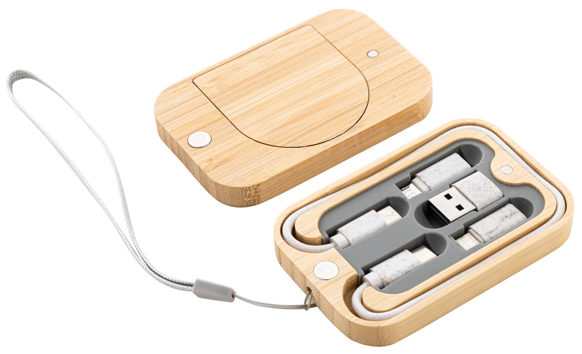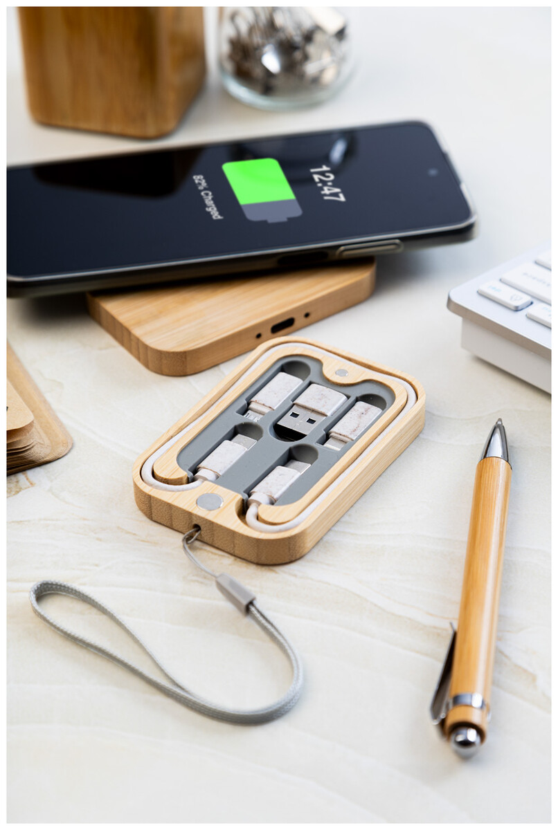Ekologická sada USB nabíjecího kabelu z pšeničné slámy a bezdrátové rychlonabíječky (15W) v magnetickém bambusovém pouzdře s popruhem. Včetně kabelu USB-C s adaptéry USB, micro USB a Lightning.
