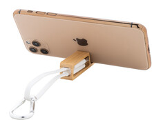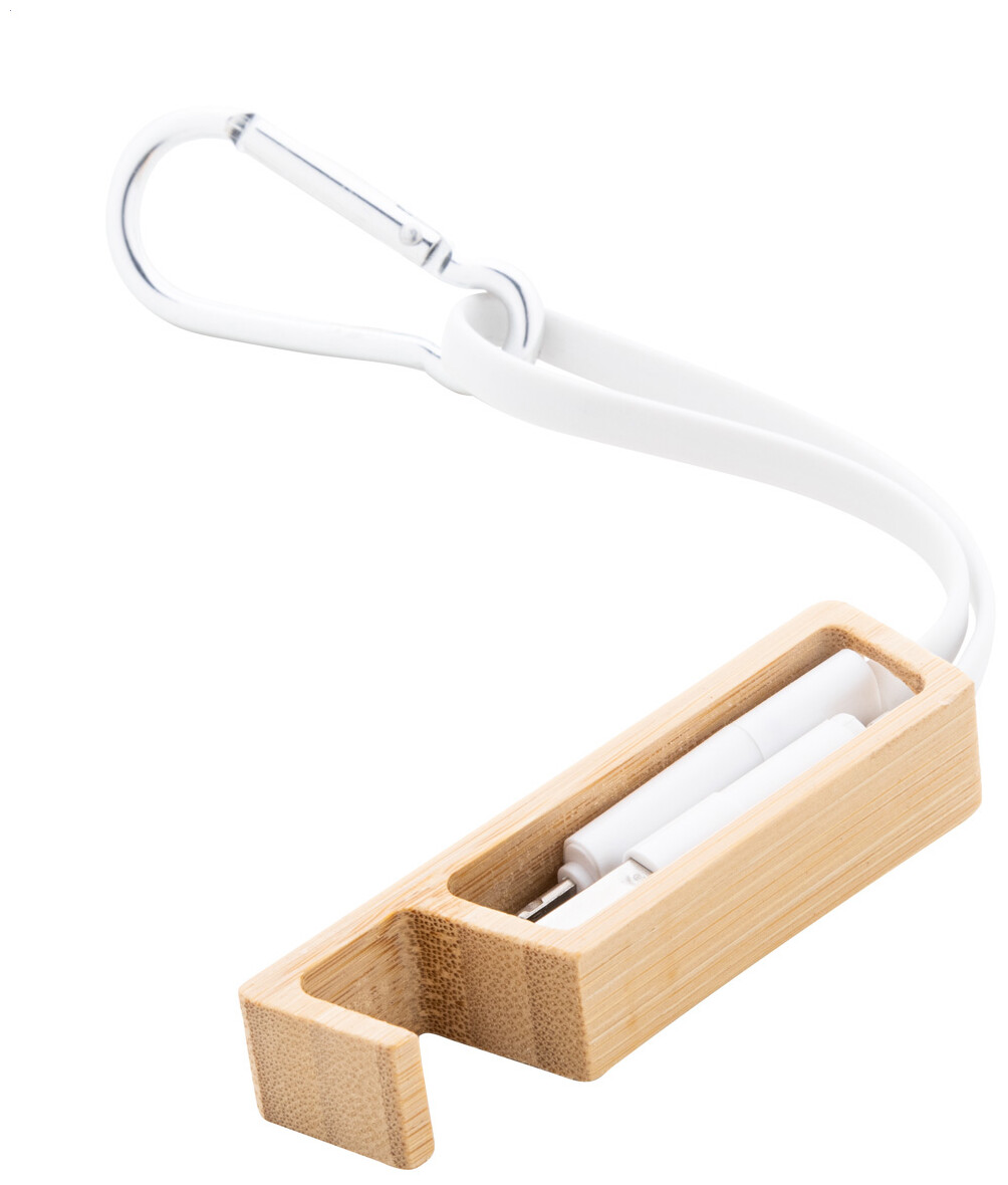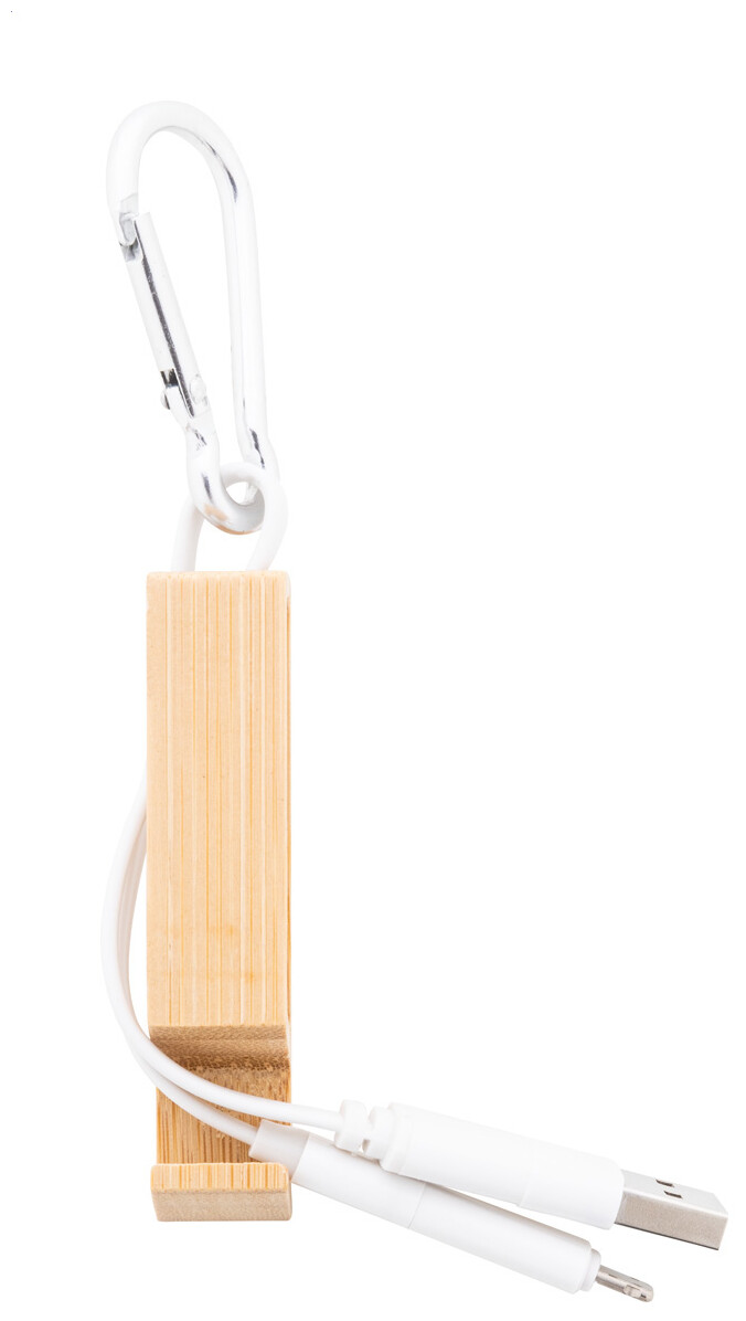 USB nabíjecí kabel s karabinou z recyklovaného hliníku a bambusovým držákem na mobil. S konektory micro USB, USB-C a Lightning. Se vstupy USB a USB-C.