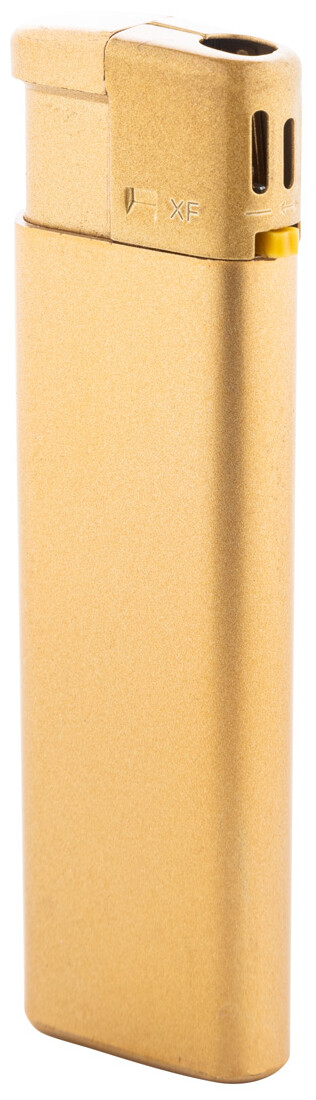 Plnitelný plastový piezo zapalovač v metalické barvě. Dětská pojistka. Dodáváno s cca. 80% hladiny plynu. K dispozici pouze v plném exportním kartonovém množství (násobky 1 000 ks)!