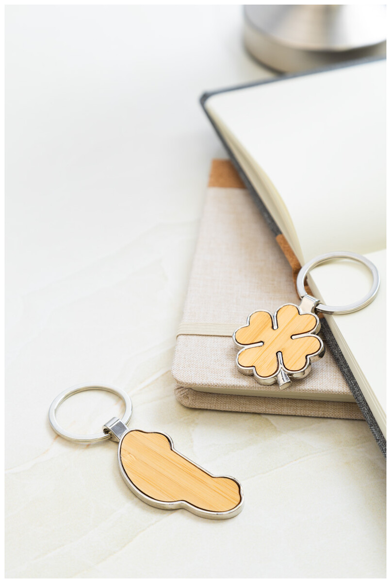 Kovový přívěšek na klíče ve tvaru čtyřlístku s bambusovou vložkou. V kraftové papírové krabičce.