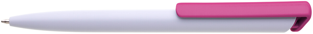 Česká propiska BOIA v minimalistickém designu bílého oválného těla s dynamickým tvarem tmavě růžového masivního klipu. Tělo i klip nabízí velký prostor pro značení logem zákazníka. Materiál plast, náplň velkoobsahová, modře píšící. BOIA je vyráběna v České republice.
