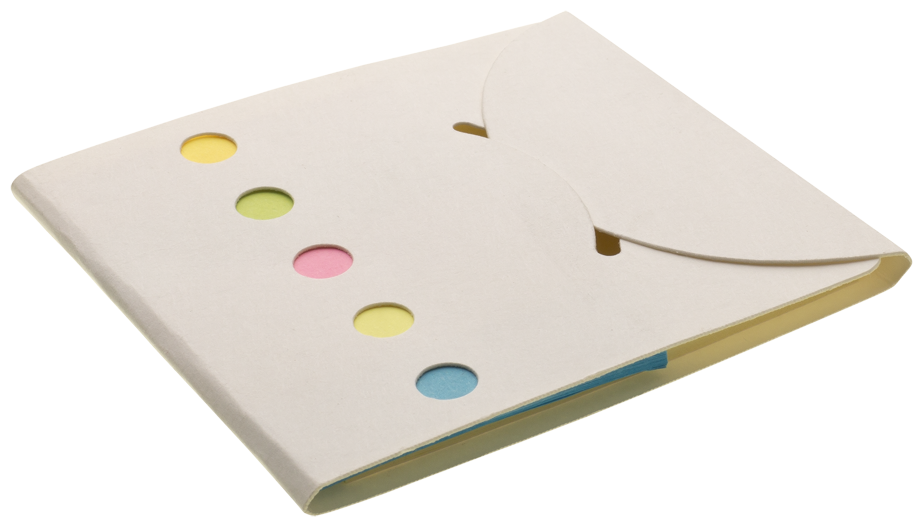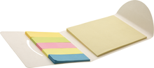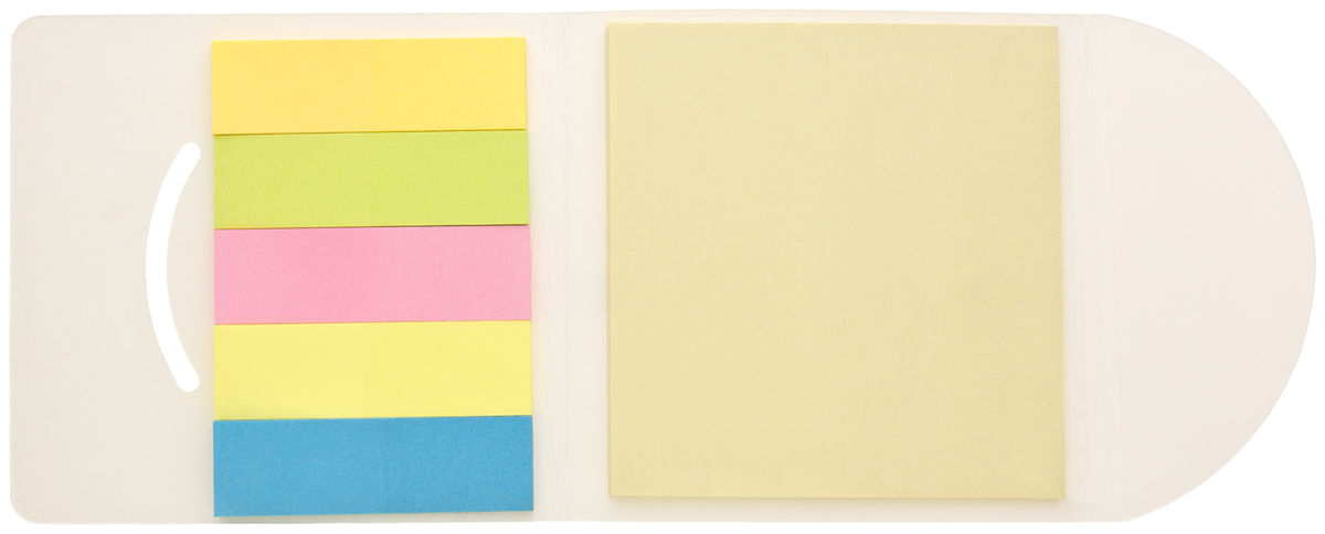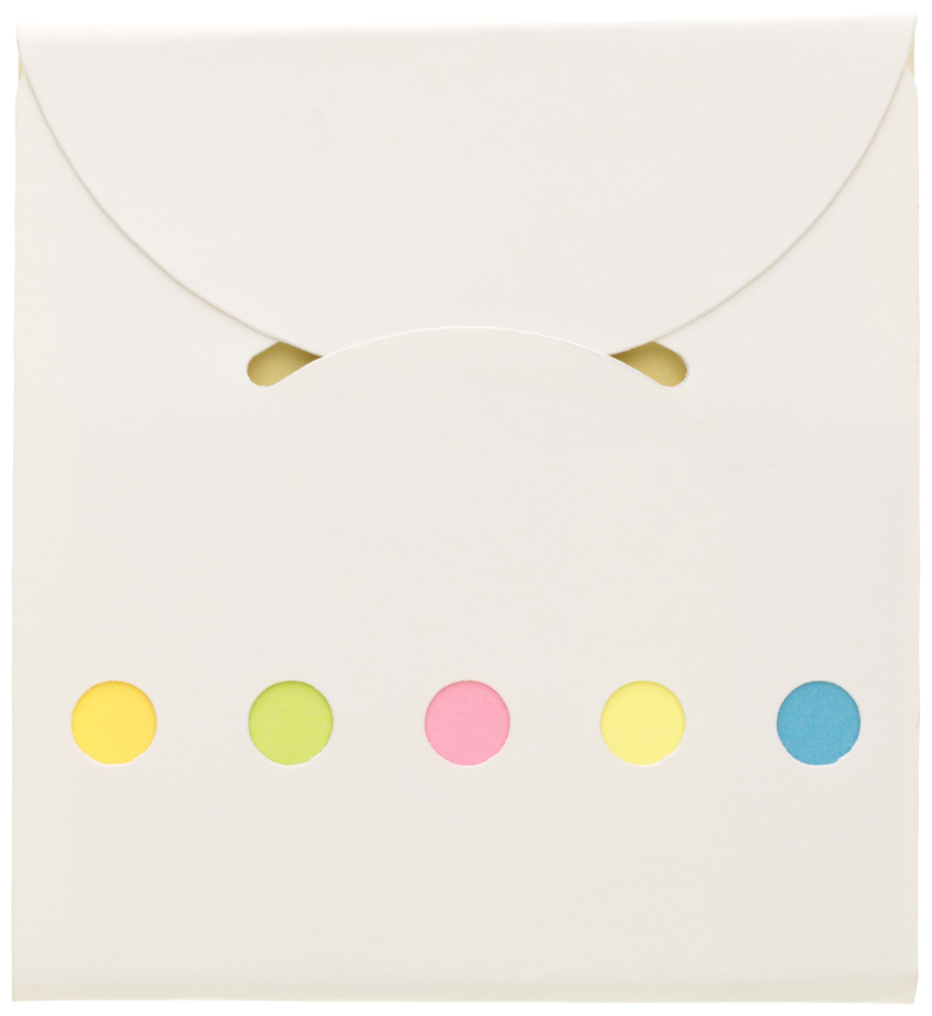 FOSFO - Lepicí bloček 75x75mm a 5 barev lepicích papírků 50x15 v bílém uzavíratelném papírovém obalu.