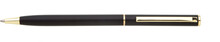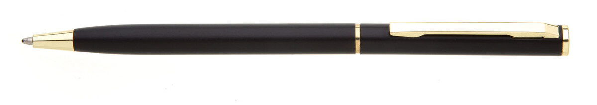Tenká černá propiska s otočným mechanismem a zlatými doplňky o rozměrech 130 x 7,5 mm. Materiál hliník, náplň modře píšící.