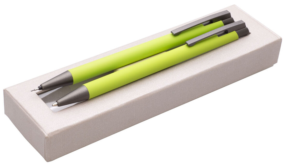 Dárková sada světle zelené propisky a mikrotužky s pogumovaným povrchem a šedými doplňky v luxusním dárkovém pouzdru s průhledným okénkem.
