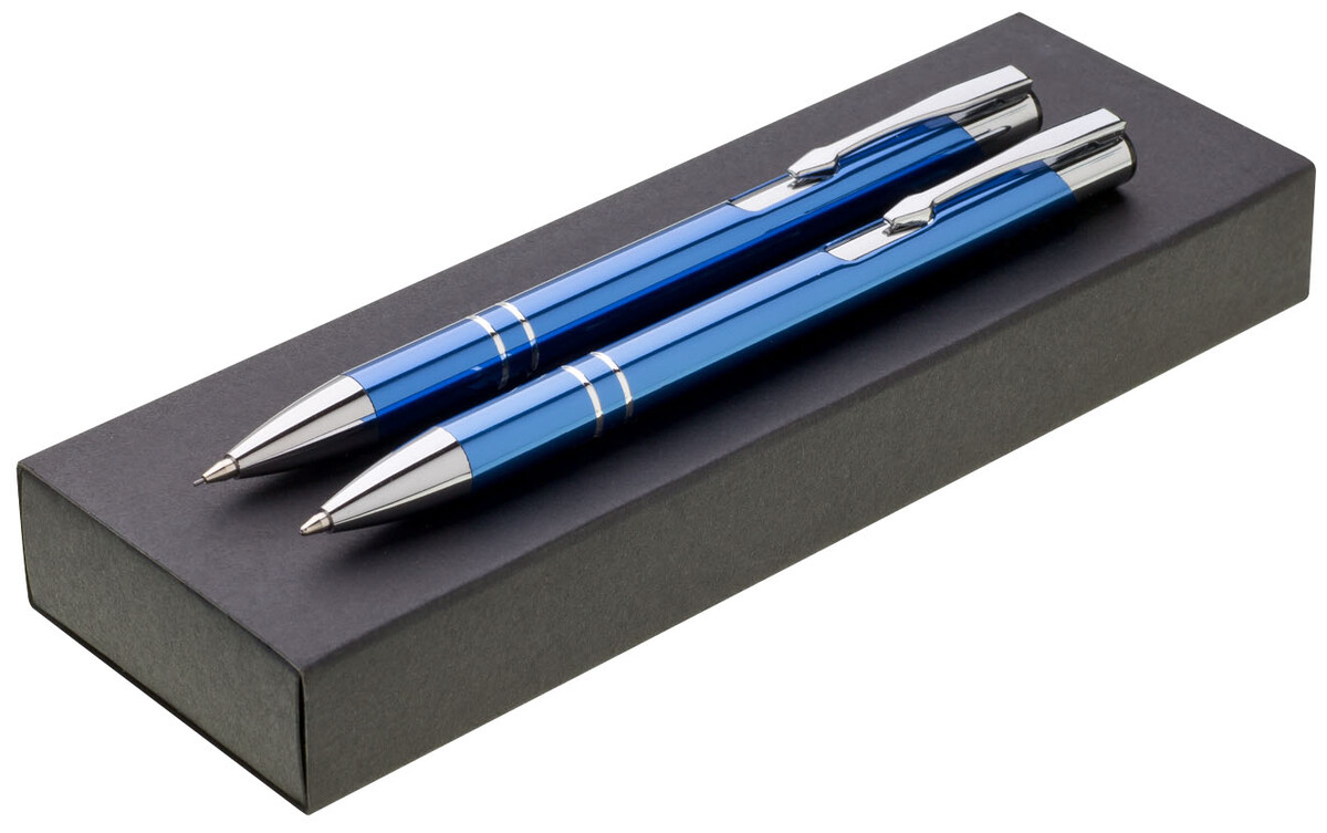 Sada ORIN modrá, tužky jsou vyrobeny z hliníku, na těle mají 2 stříbrné proužky a doplňky. Dodávají se v papírové krabičce.
