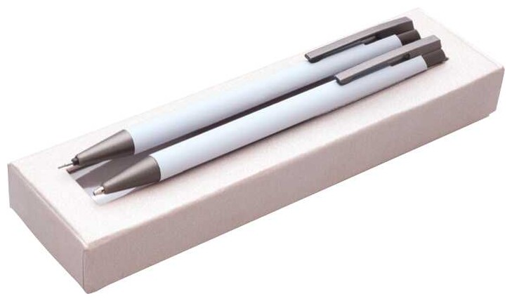 Dárková sada bílé propisky a mikrotužky s pogumovaným povrchem a šedými doplňky v luxusním dárkovém pouzdru s průhledným okénkem.