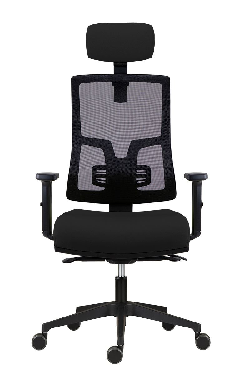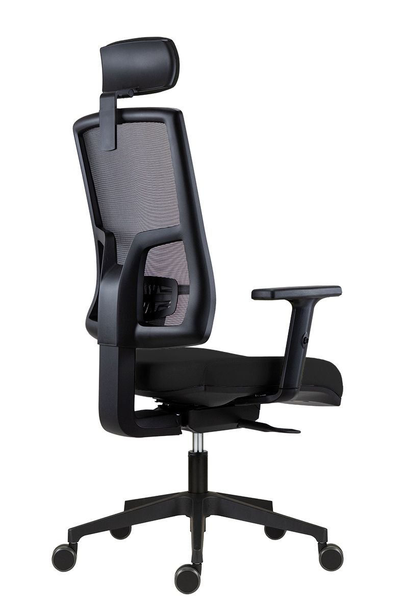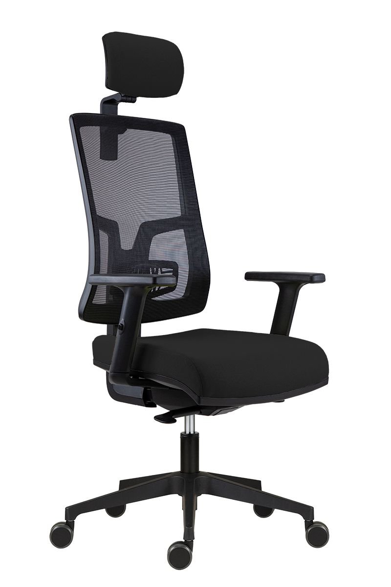 kancelářská židle s čalouněným sedákem, černou síťovinou na opěráku a volitelným čalouněným podhlavníkem