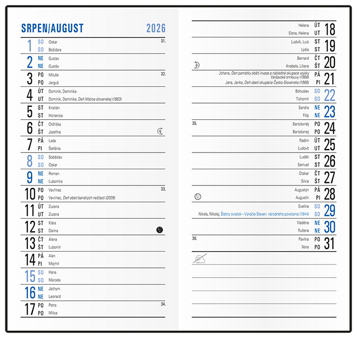 - osobní záznamy, důležitá telefonní čísla, roční plánovací kalendář aktuálního roku CZ/SK, tabulkový kalendář následujícího roku CZ/SK, místo na poznámky