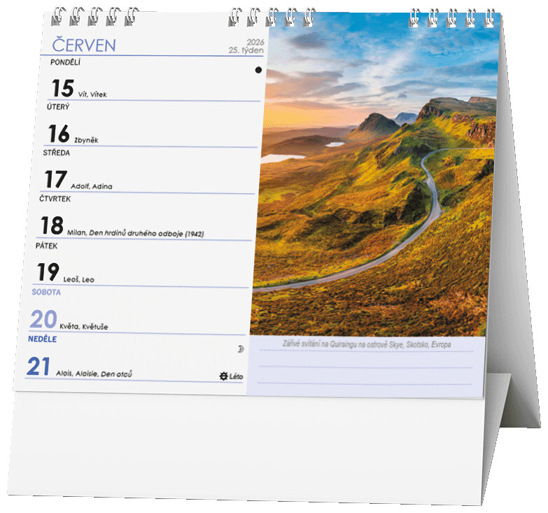 - státní svátky, ostatní svátky a významné dny, tabulkový kalendář aktuálního a nadcházejícího roku, místo na poznámky
