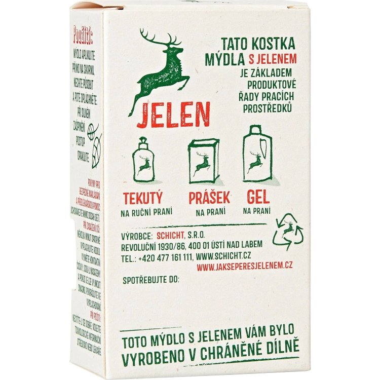 Toaletní mýdlo Jelen, na ruční praní, 200 g je tradiční mýdlo určené k ručnímu praní, které účinně odstraňuje nečistoty a skvrny z oděvů, a zároveň je šetrné k pokožce rukou.