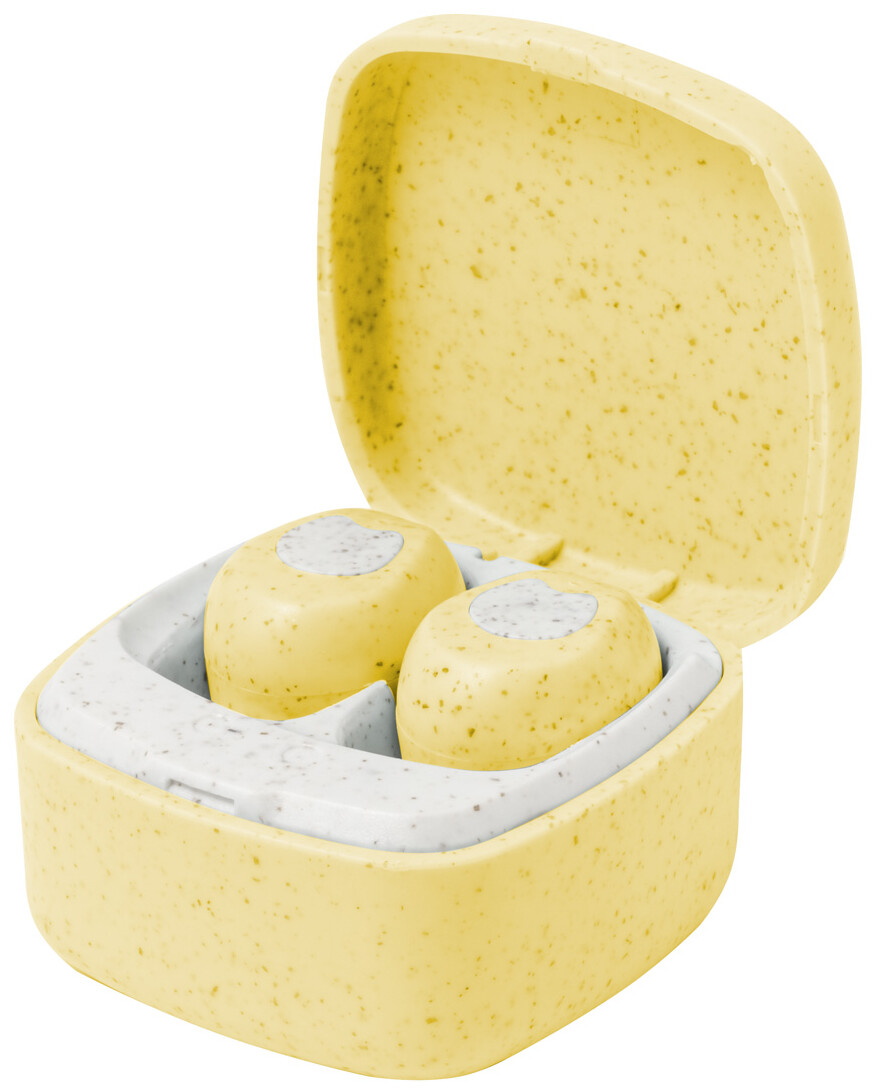 Ekologická plastová sluchátka s pšeničnou slámou, skutečně bezdrátová stereofonní sluchátka (TWS) s funkcí handsfree volání v nabíjecím pouzdře. Včetně nabíjecího kabelu USB.