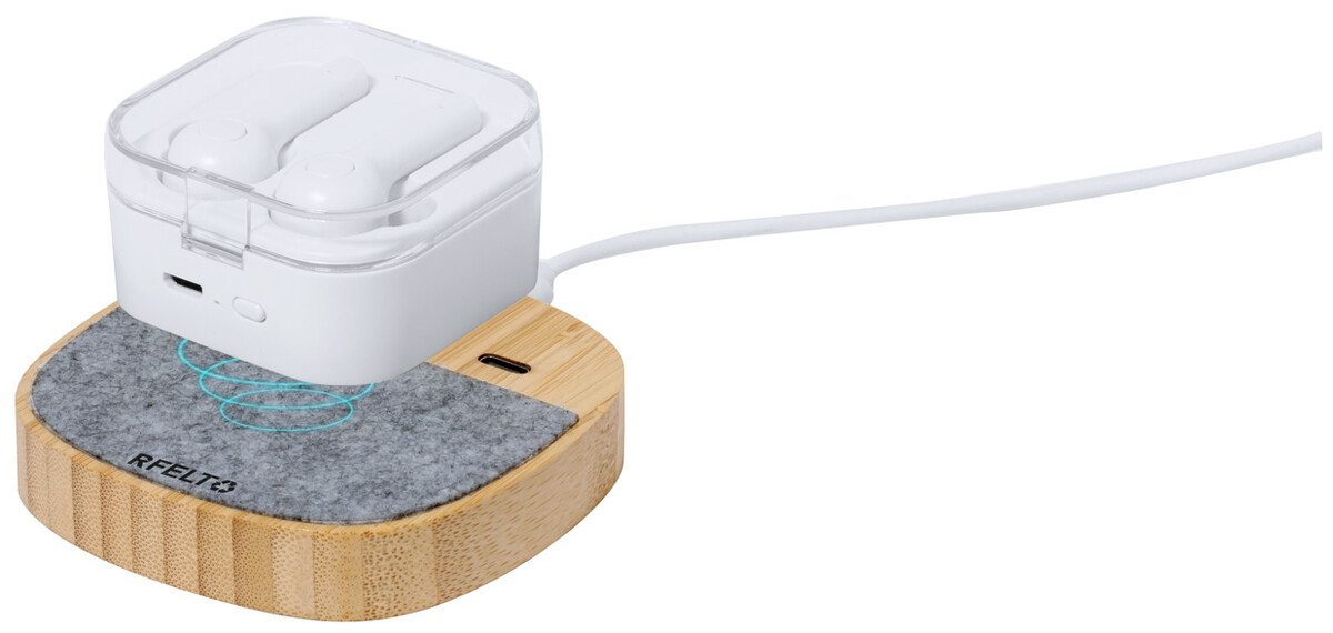 Bezdrátová rychlonabíječka (15W) v pouzdru z bambusu a RPET plsti. S 1 USB a 1 USB-C nabíjecím portem pro současné kabelové a bezdrátové nabíjení. Včetně USB nabíjecího kabelu.