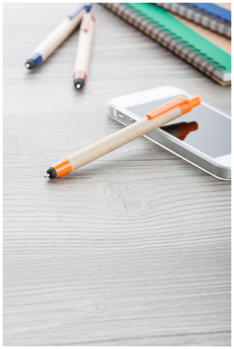 Kuličkové pero z recyklovaného papíru s dotykovým perem s barevnou špičkou a klipem, s modrou náplní.